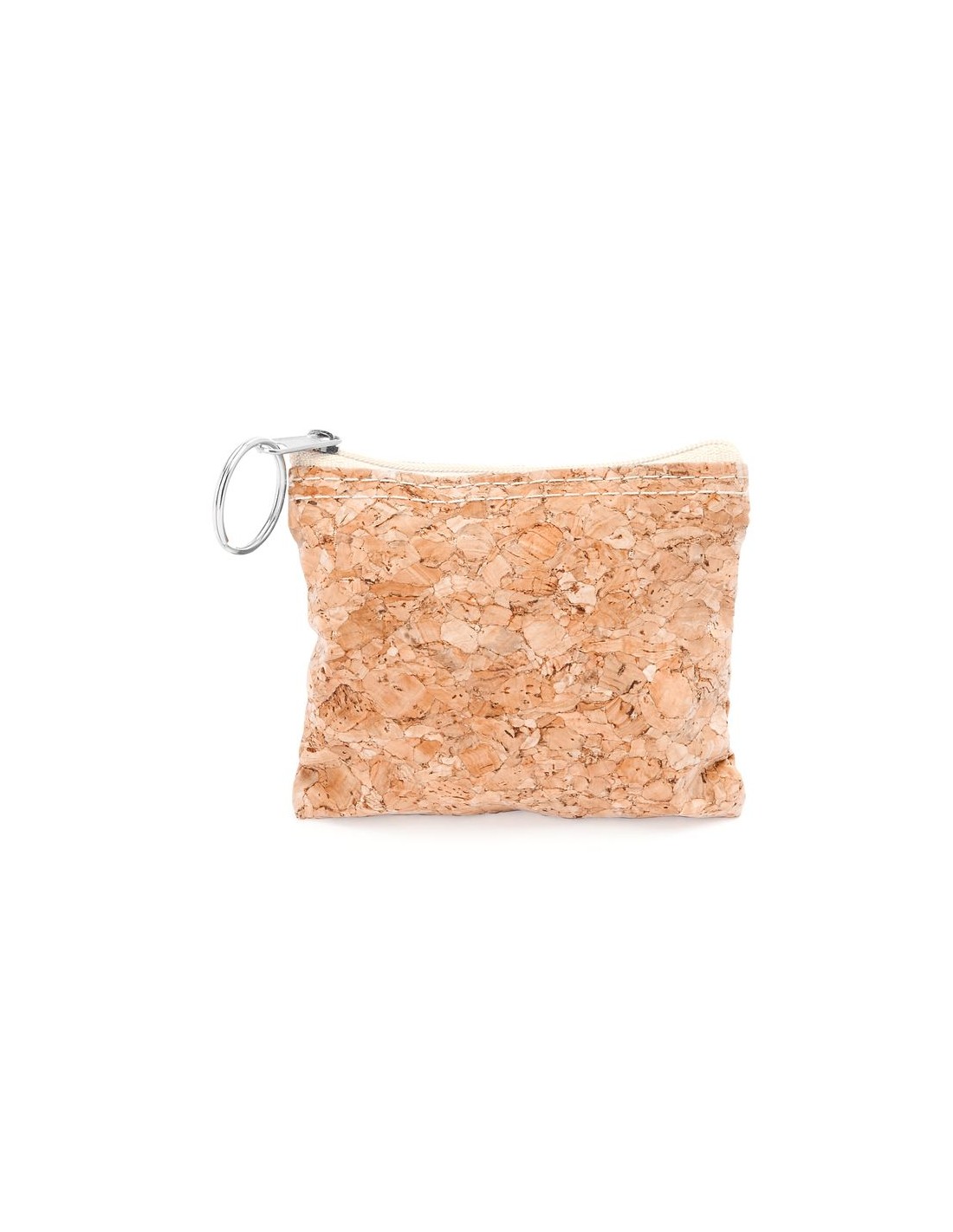 Portamonete in sughero naturale con anello argentato sul tirazip.