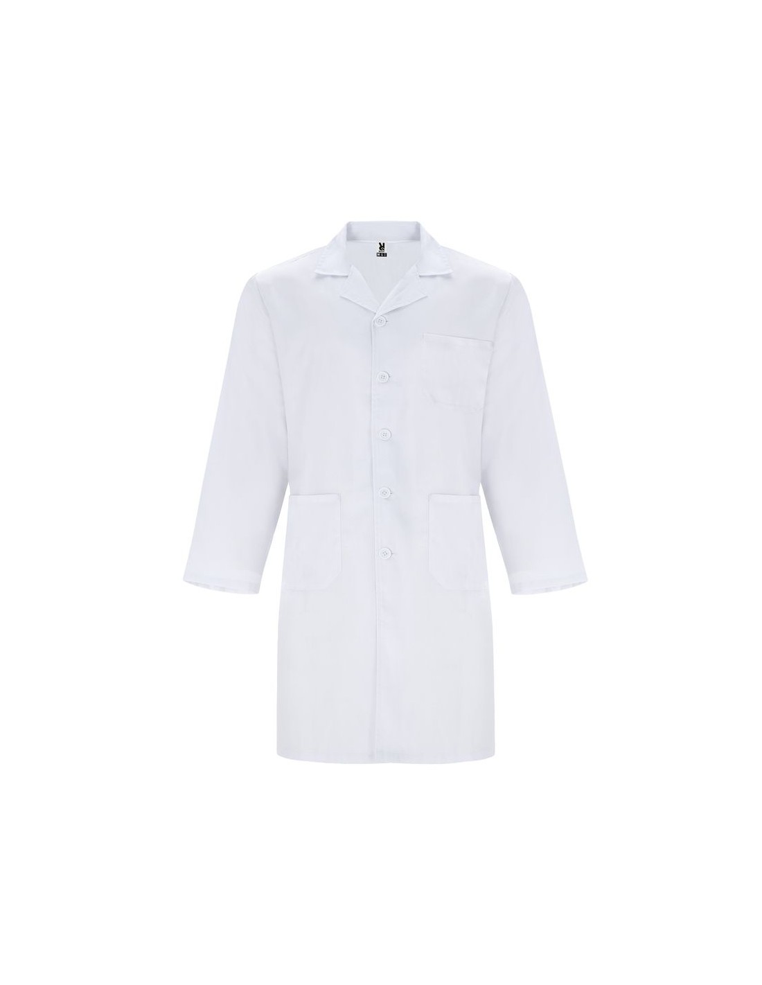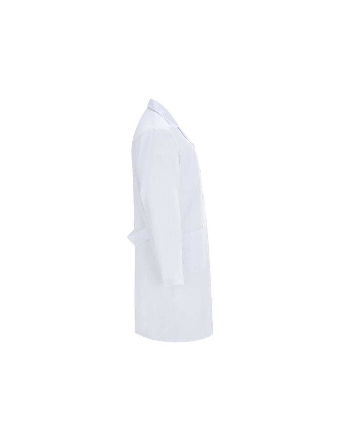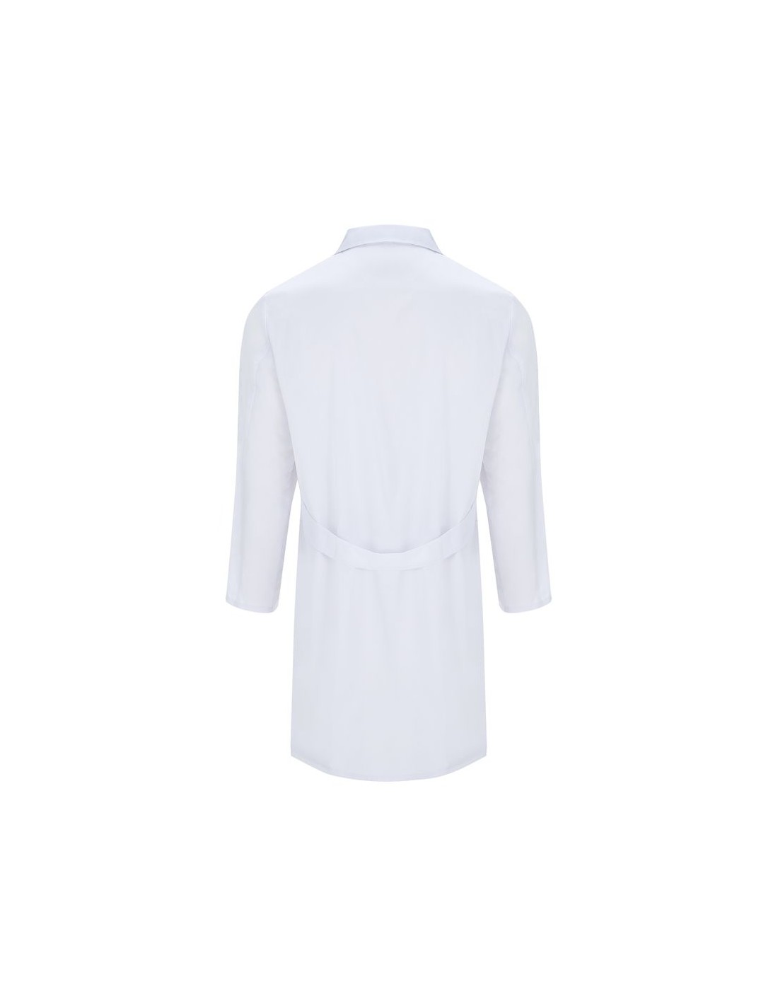 Camice di serivizio manica lunga: 1. Collo con bavero. 2. Apertura centrale con 5 bottoni in tinta. 3. Una tasca sul petto e due laterali. 4. Cinturino posteriore.