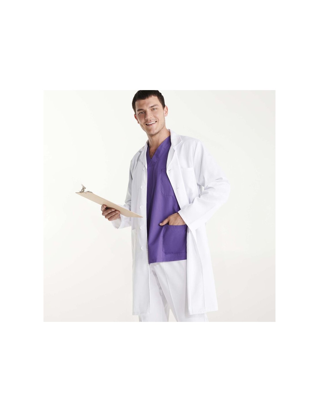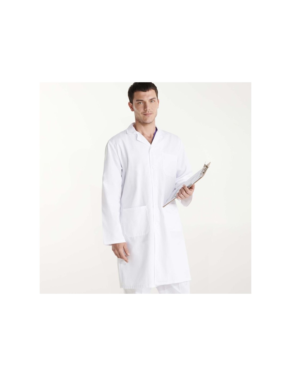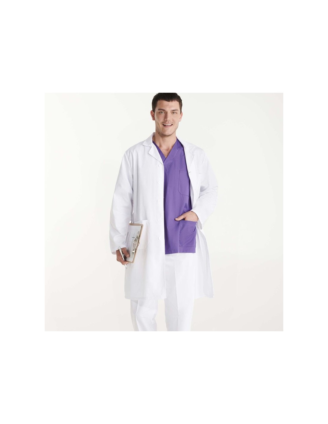 Camice di serivizio manica lunga: 1. Collo con bavero. 2. Apertura centrale con 5 bottoni in tinta. 3. Una tasca sul petto e due laterali. 4. Cinturino posteriore.