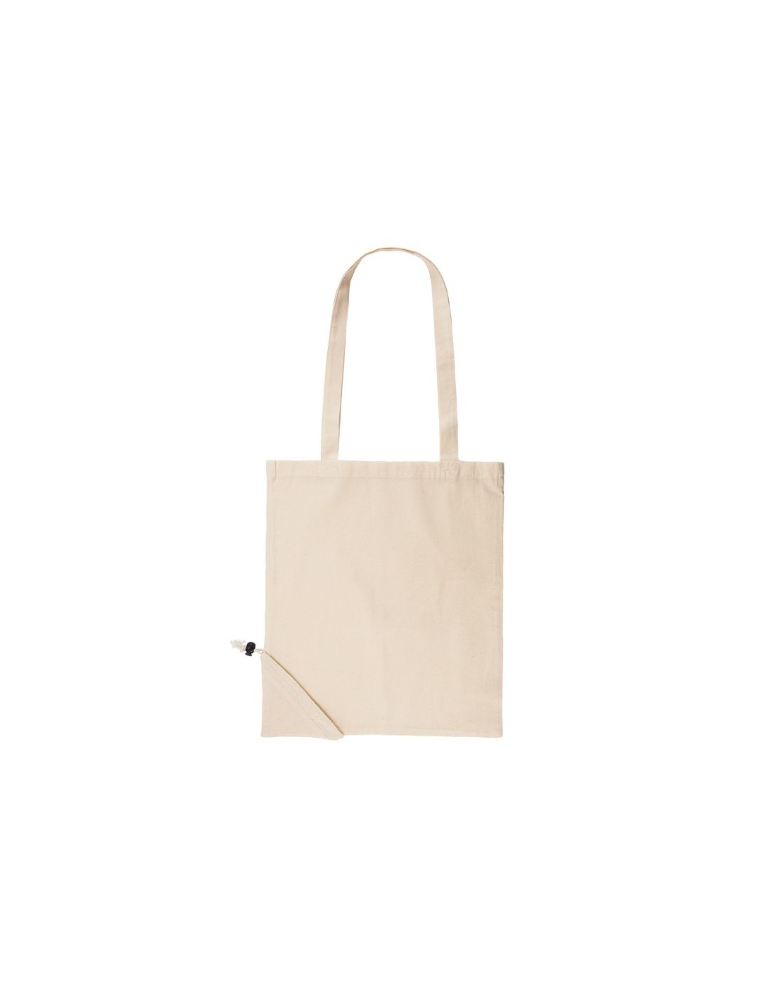 Borsa della spesa pieghevole 100% cotone 105gr/m2, con manici lunghi 70cm e cordoncino pieghevole regolabile.