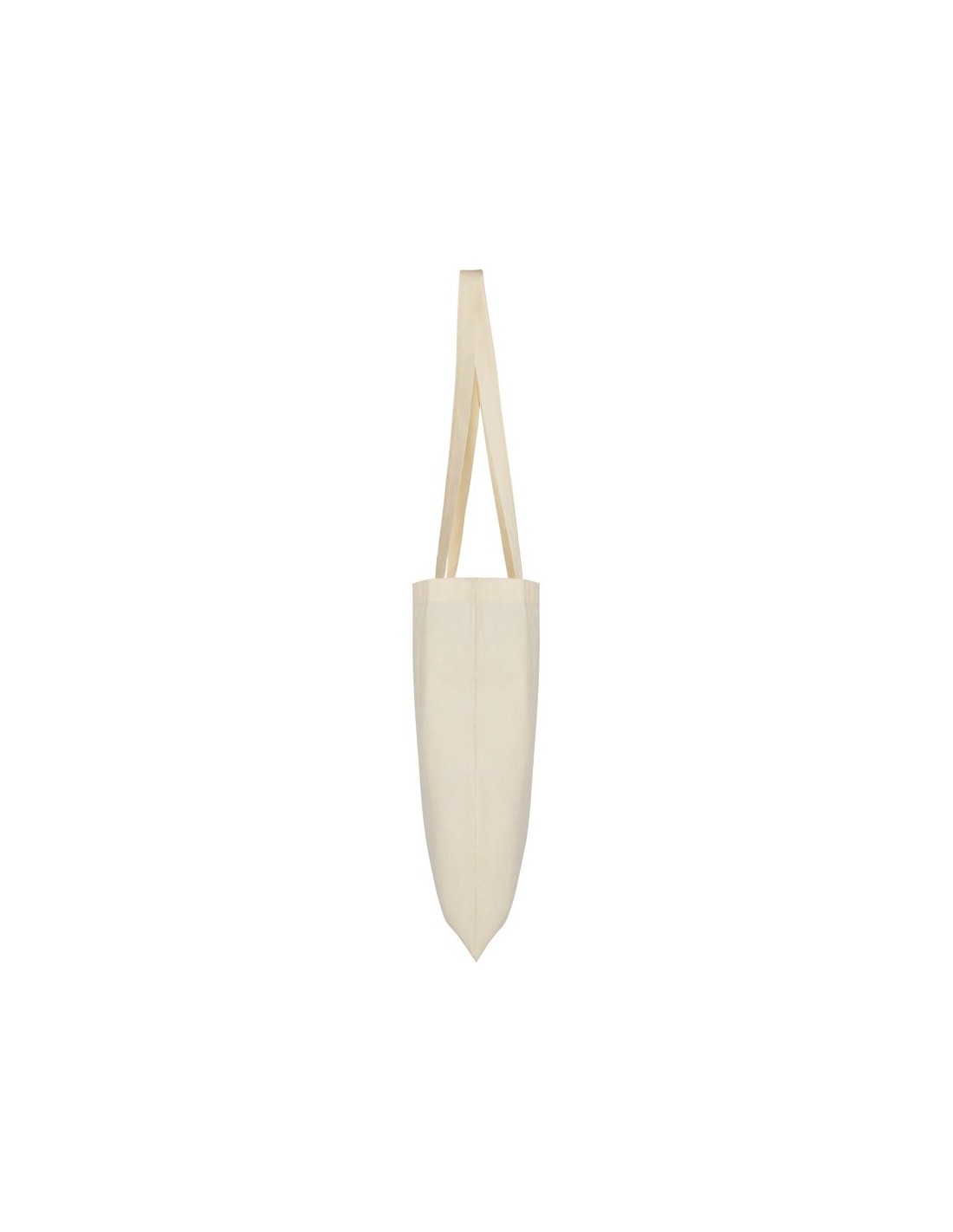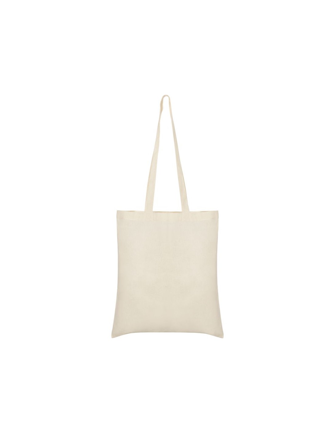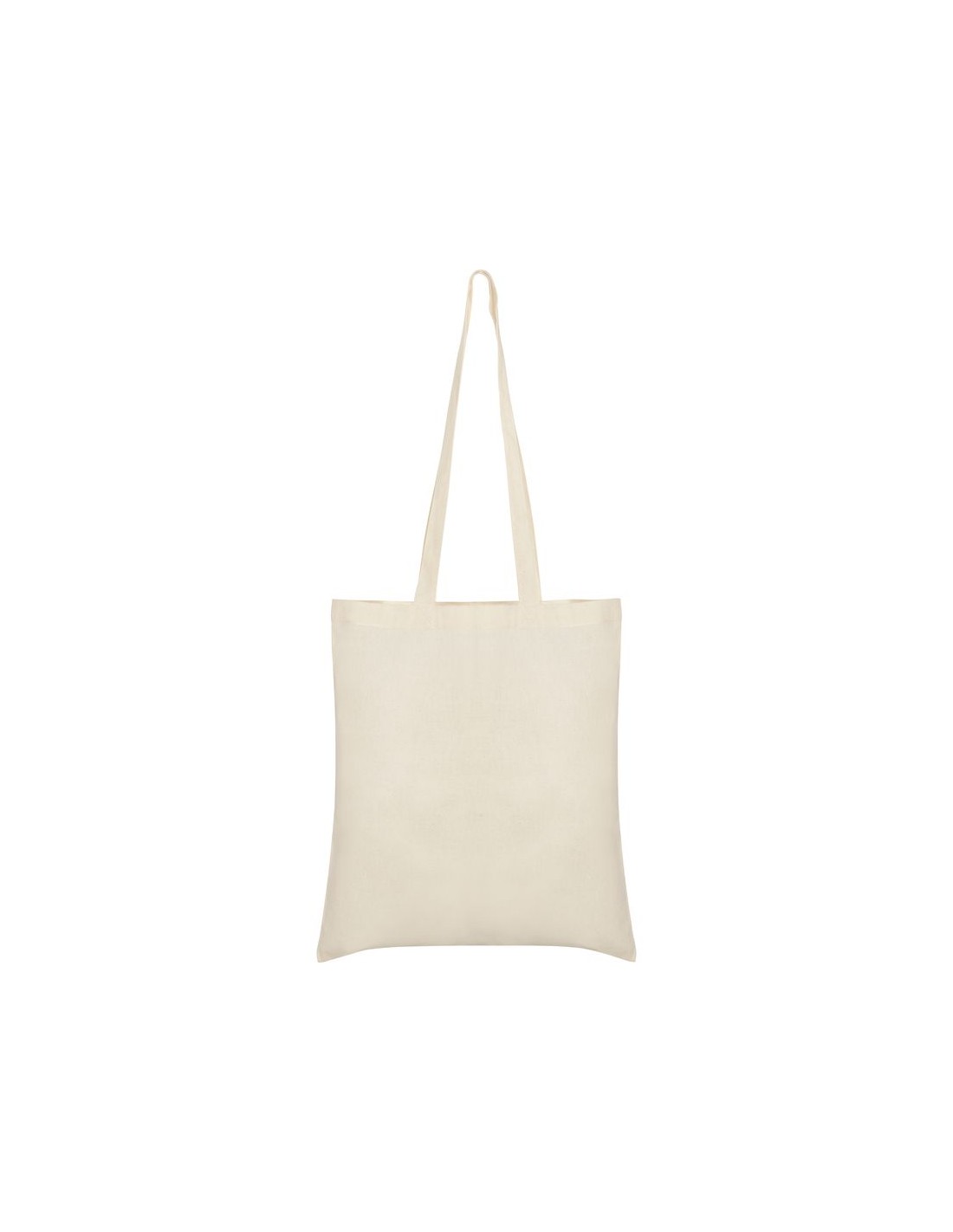 Borsa in tessuto di cotone in colore naturale, con manico lungo a nastro dello stesso colore.
