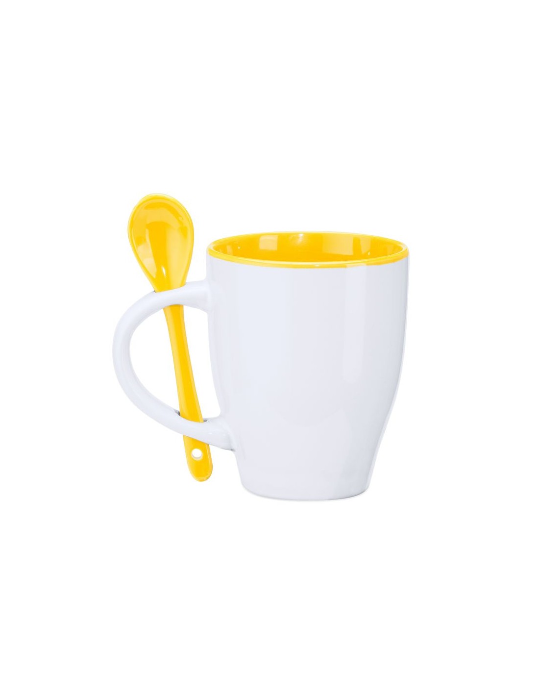 Tazza in ceramica. Capacità 350ml, l'interno della tazza e il cucchiaio sono dello stesso colore, scatola di cartone bianca.