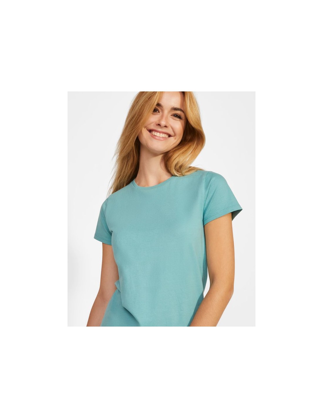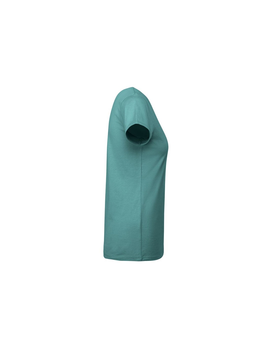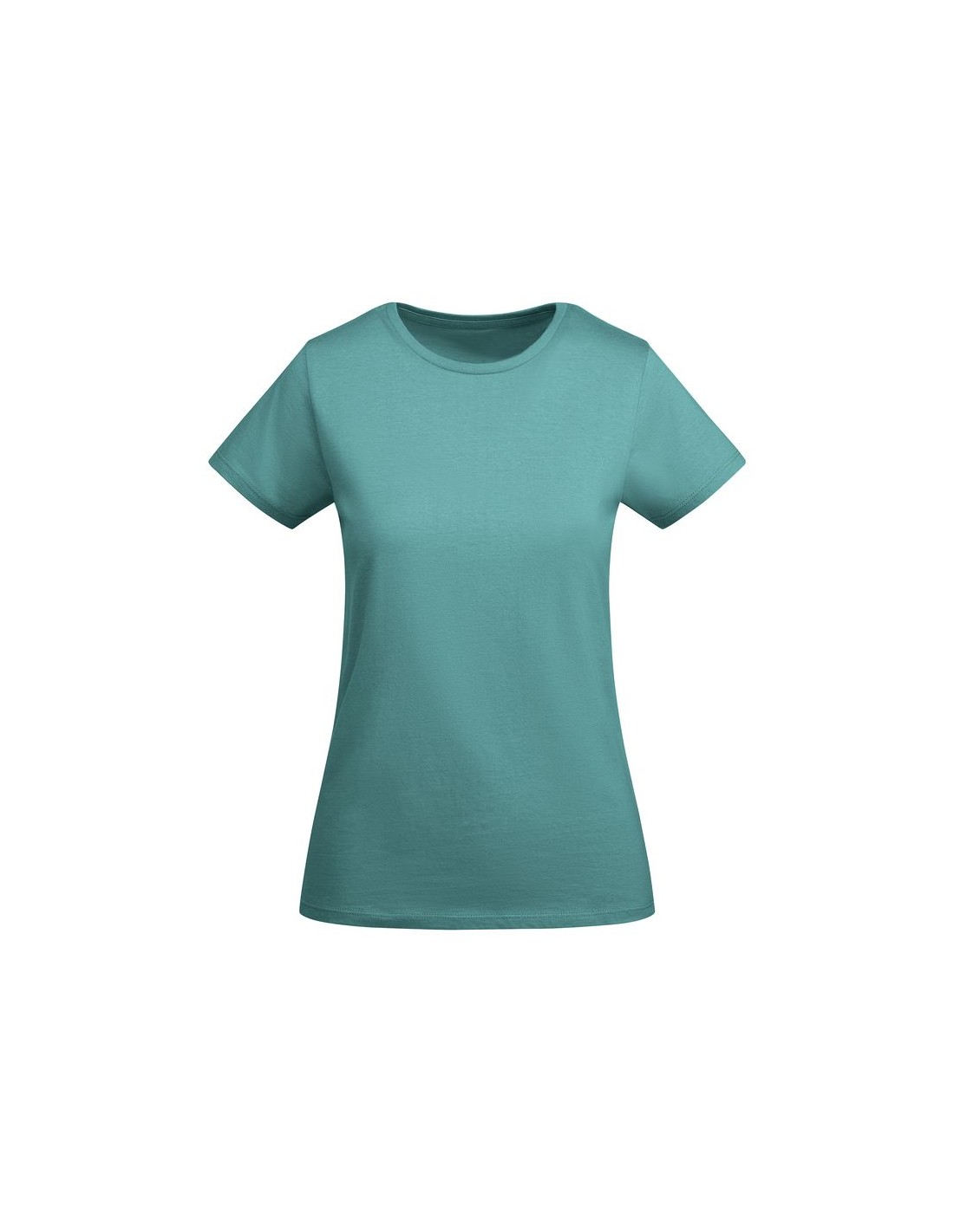 T-shirt donna aderente a maniche corte in cotone organico certificato OCS, collo rotondo in costina 1x1, copri cuciture rinforzate sul colletto, cuciture laterali.