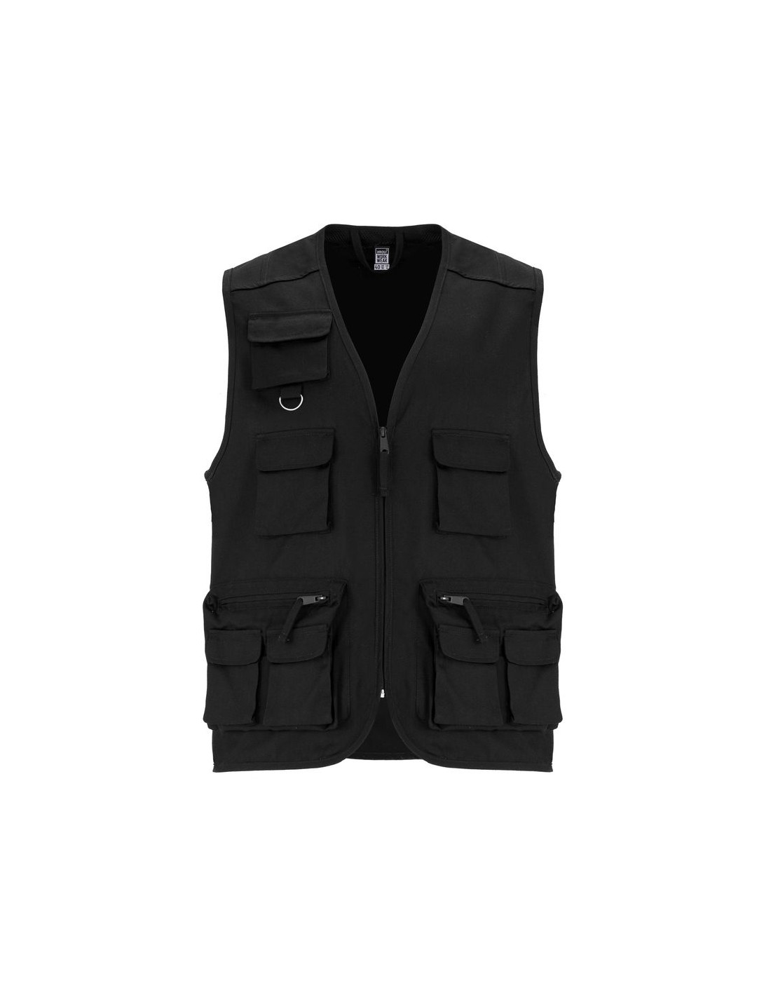 Gilet multiuso da lavoro:Cerniera centrale con tiretto, collo a V, tre tasche sul petto con pattine, tasca superiore con anello multifunzione, due tasche laterali con cerniera e tiretto, con due taschini sovrapposti con pattina e chiusura in velcro, collo, giro maniche e orlo con bordatura.