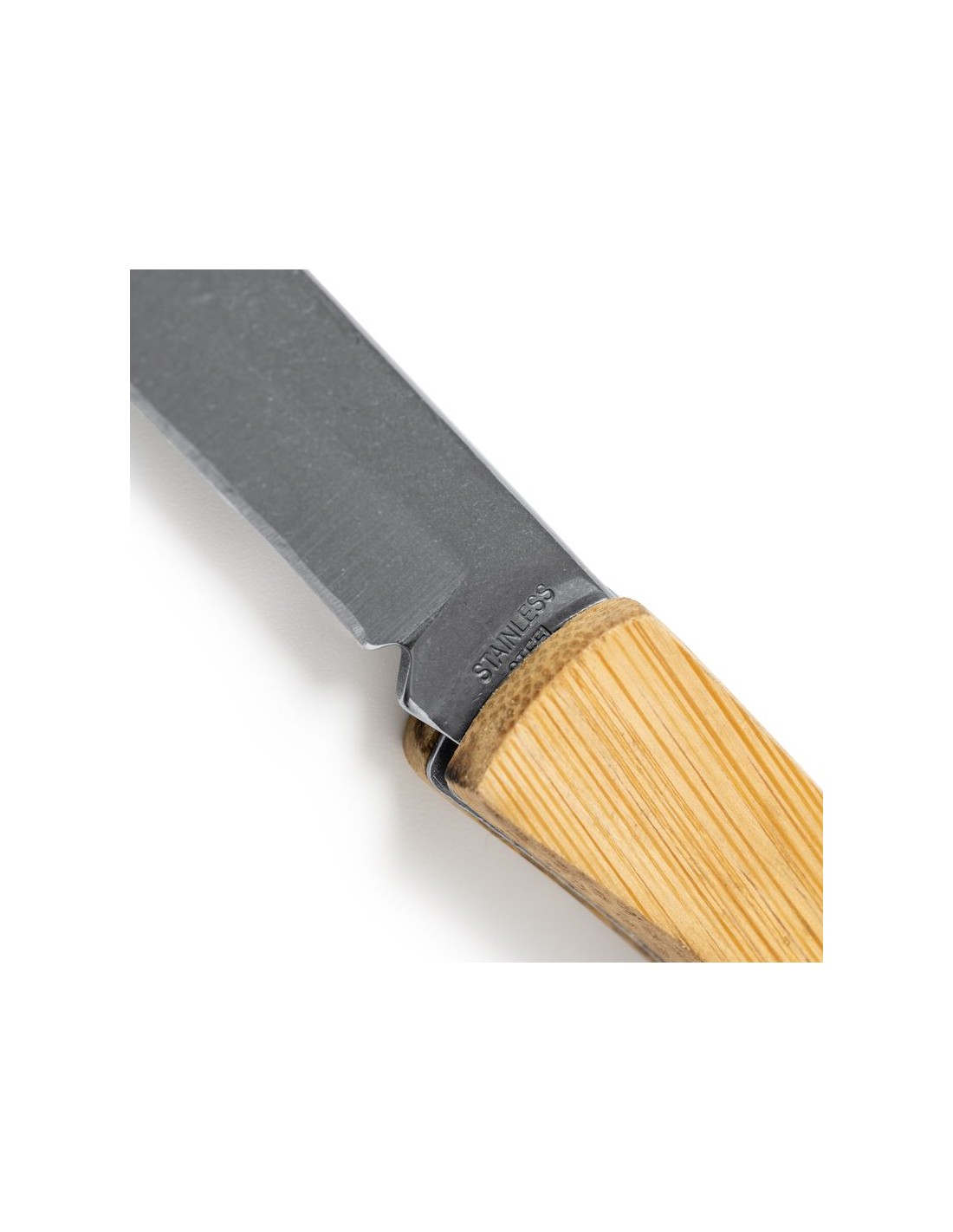 Coltello a serramanico in acciaio inox con impugnatura in bambù naturale, cinturino per il trasporto incluso, confezione in scatola dal design ecologico.