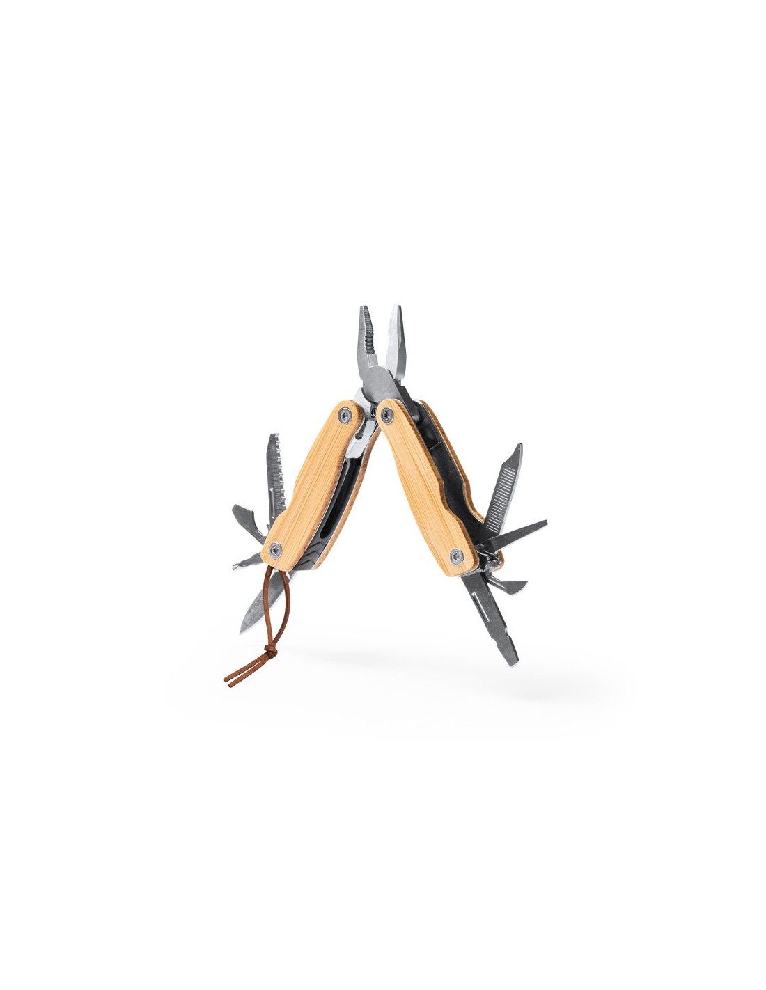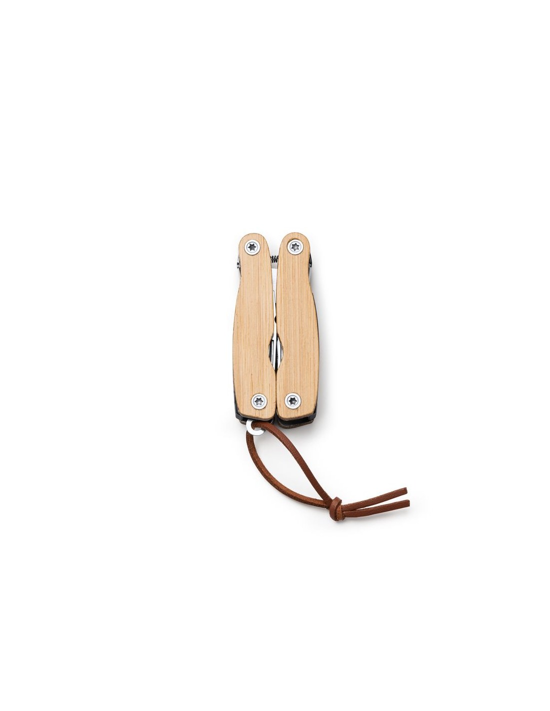 Utensile multiuso con corpo e accessori in acciaio inox e impugnatura in bambù, 12 funzioni: rasoio, sega, lima, apripista, cacciavite e pinze, include tracolla per il trasporto.