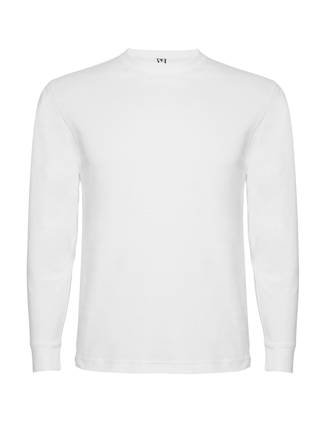 T-shirt manica lunga, tessuto tubolare, girocollo a 4 strati e polsini in costina 1x1, copri cuciture rinforzate su collo e spalle.