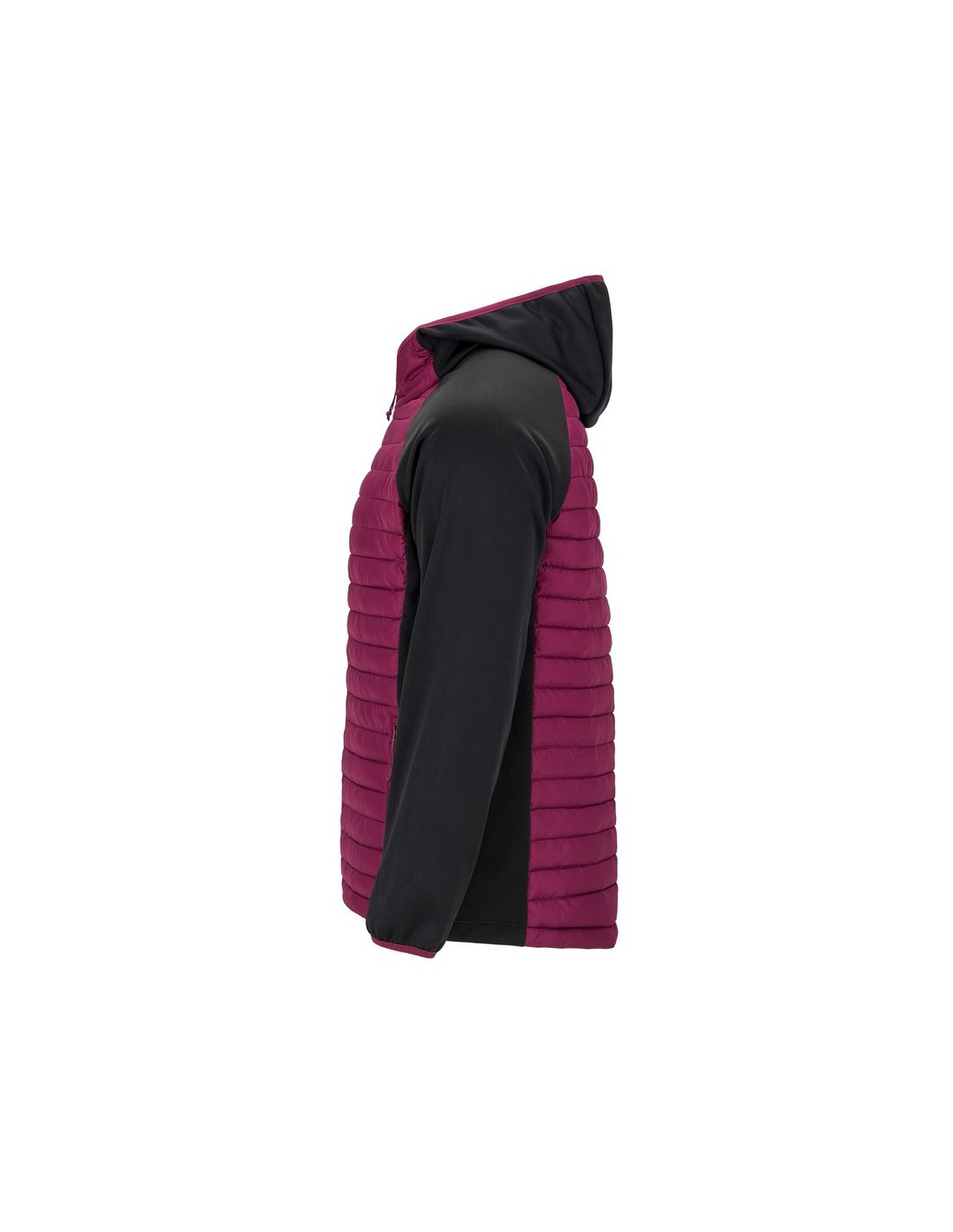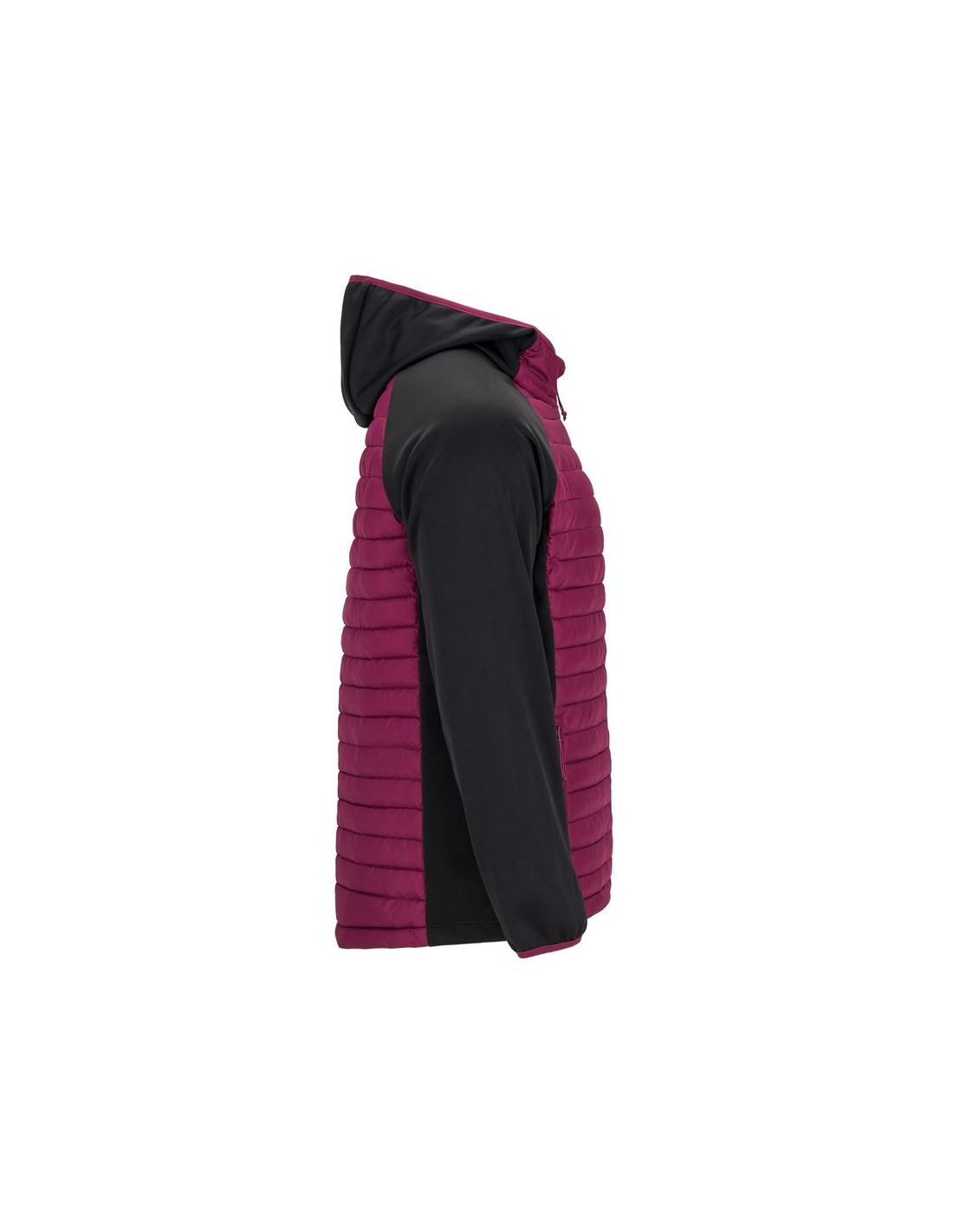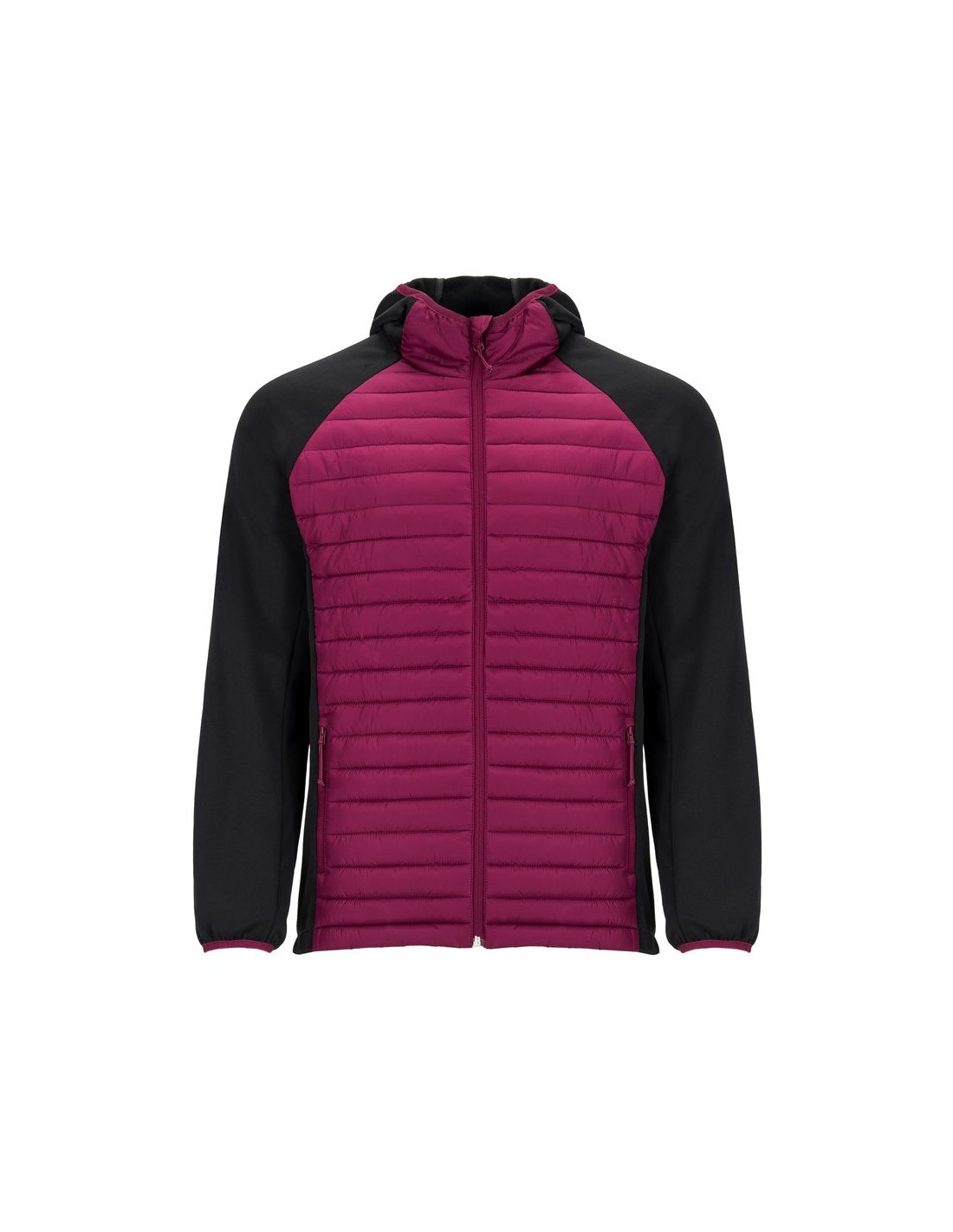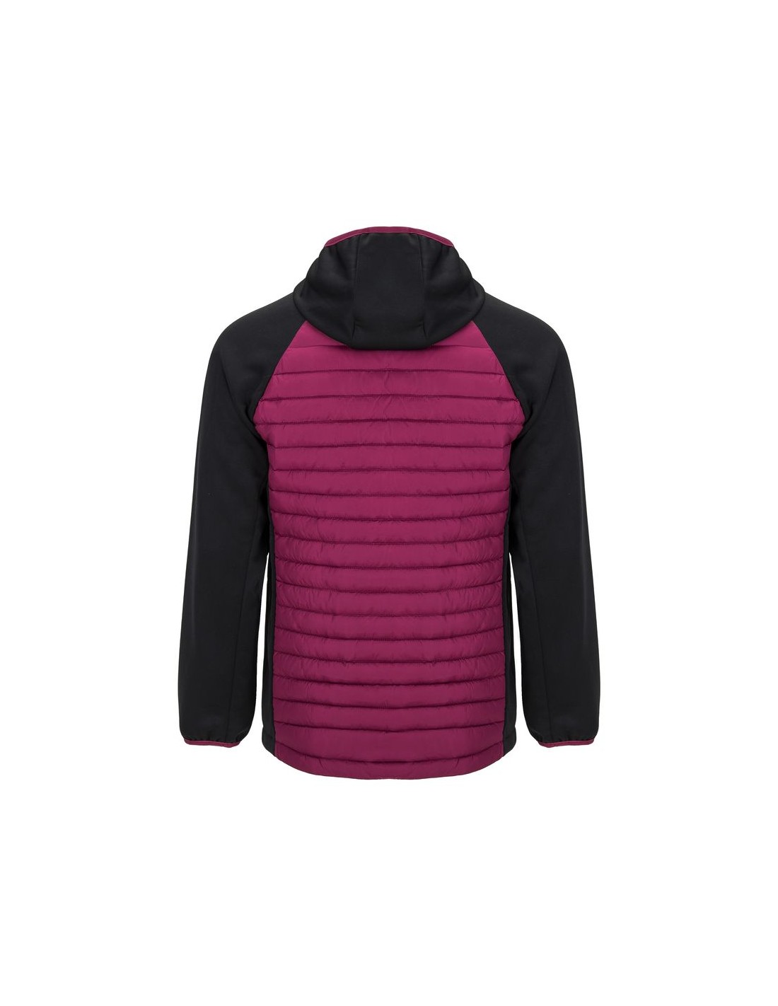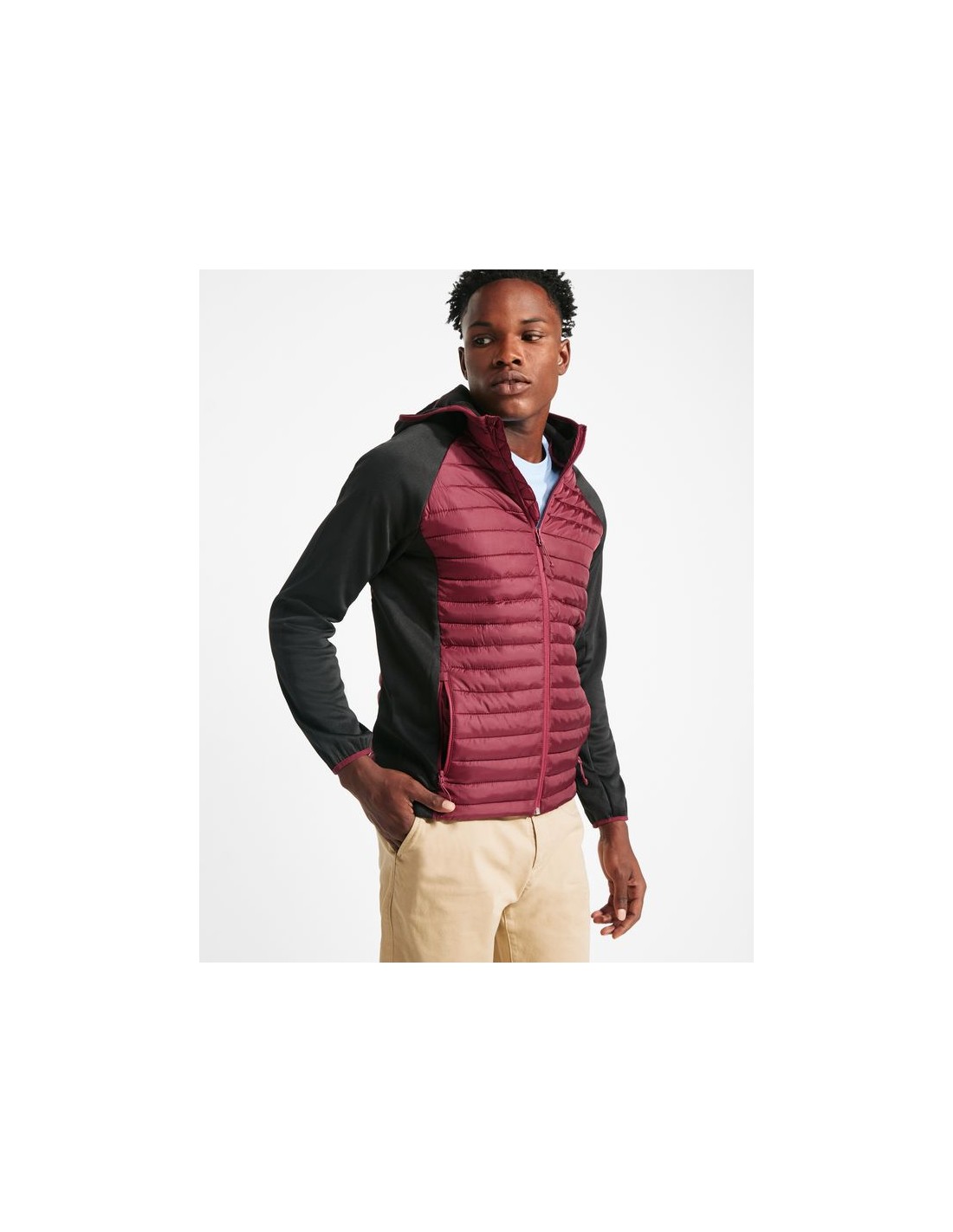 Giacca da uomo composta da due tessuti: Cappuccio fisso, manica stile ranglan, tessuto softshell nelle maniche, pannelli laterali e cappuccio, tessuto imbottito tatto piuma nella parte frontale e nella schiena, cerniera invertita in tinta con protettore per il mento e tiretto, due tasche frontali con cerniera, bordatura elastica in tinta su cappuccio e polsini.