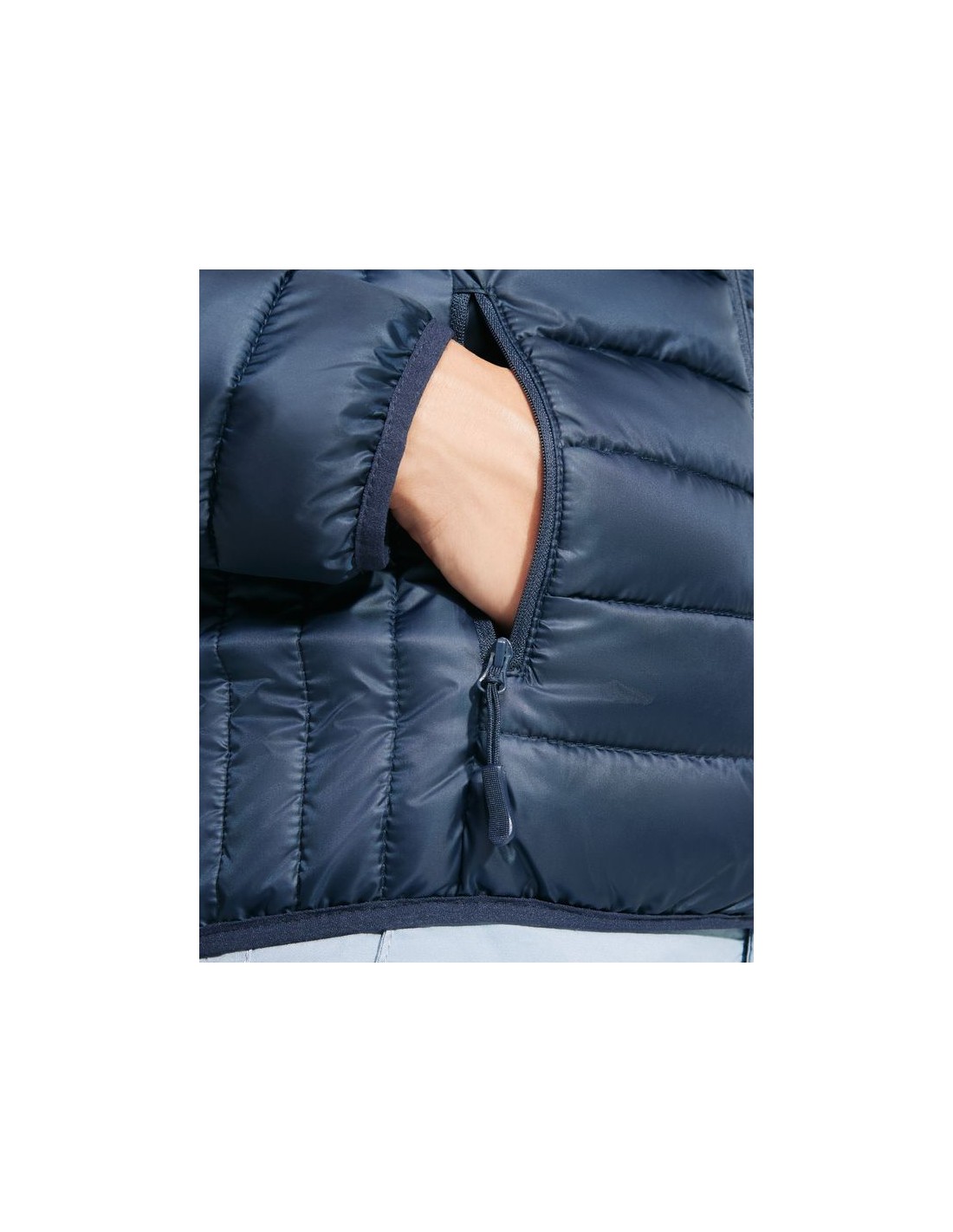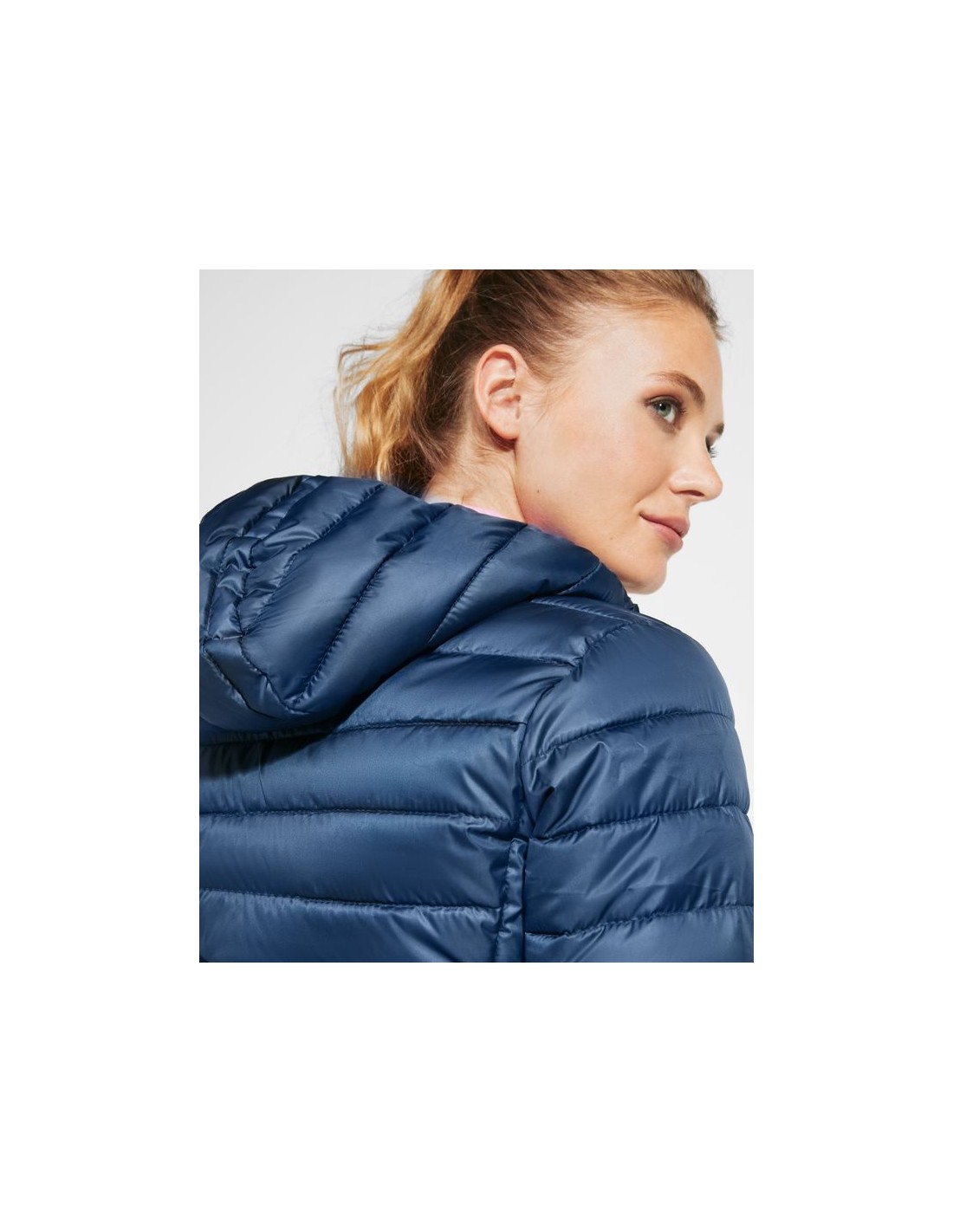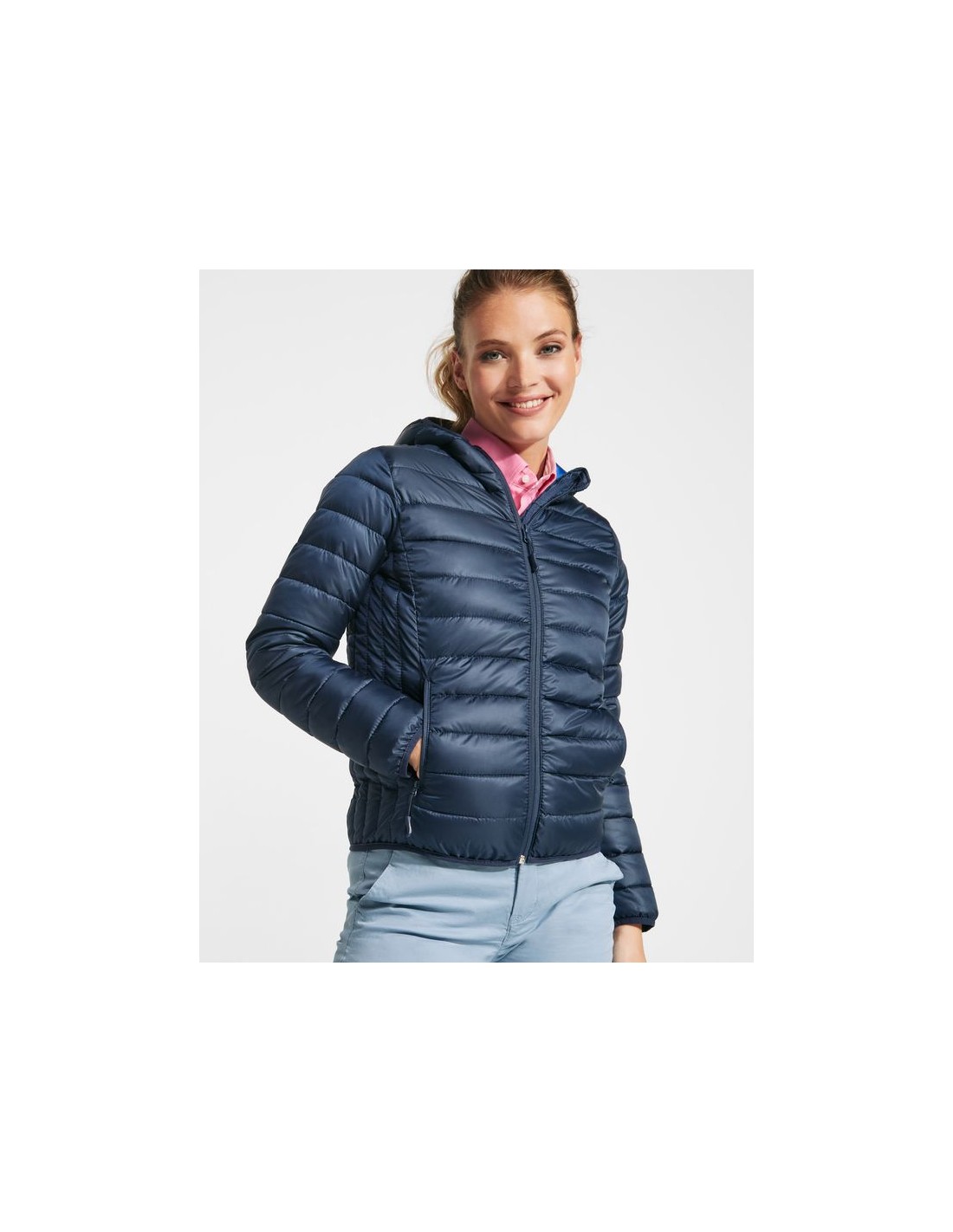 Giacca da donna trapuntata con imbottitura tatto piuma e cappuccio regolabile, cerniera invertita in tinta con protezione mento, due tasche frontali con cerniere, orlatura elastica in tinta su polsini, girovita e apertura del cappuccio, rivestimento interno a contrasto, include custodia per il trasporto, capo di abbigliamento leggero e pieghevole, taglio aderente.