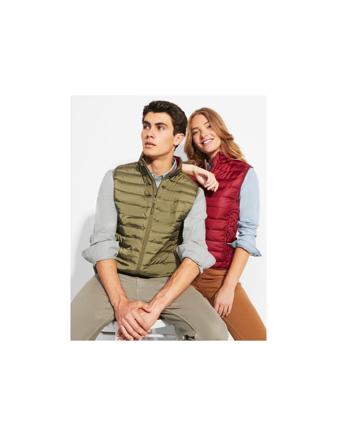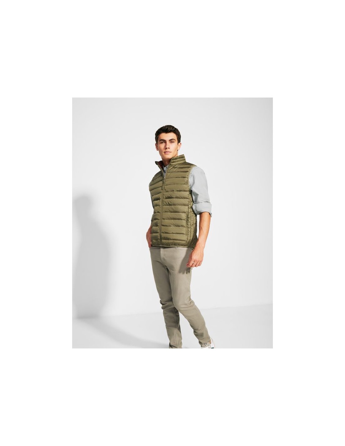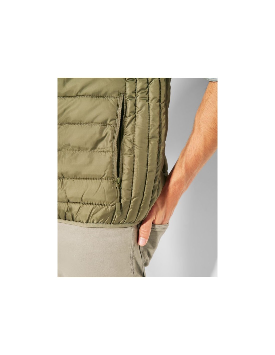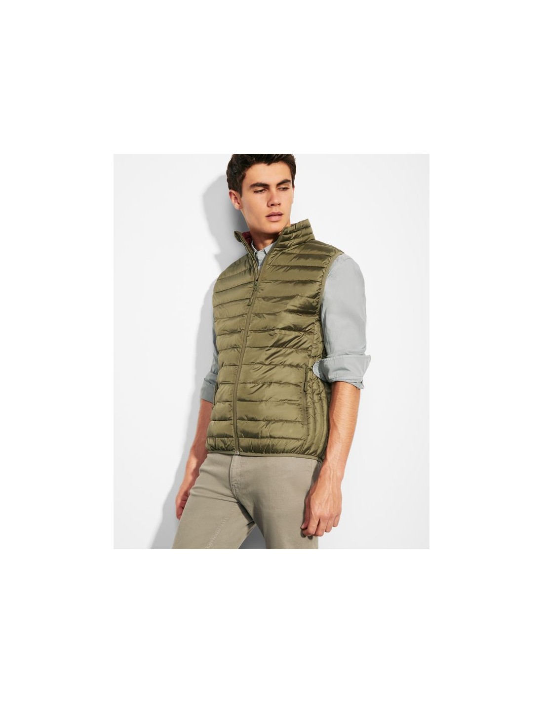 Gilet da uomo trapuntato con imbottitura tatto piuma, cerniera invertita in tinta, due tasche frontali con cerniera, rivestimento interno a contrasto, orlatura elasticizzata in tinta sul girovita, include custodia per il trasporto, capo di abbigliamento leggero e pieghevole, taglio aderente nel modello per donna.
