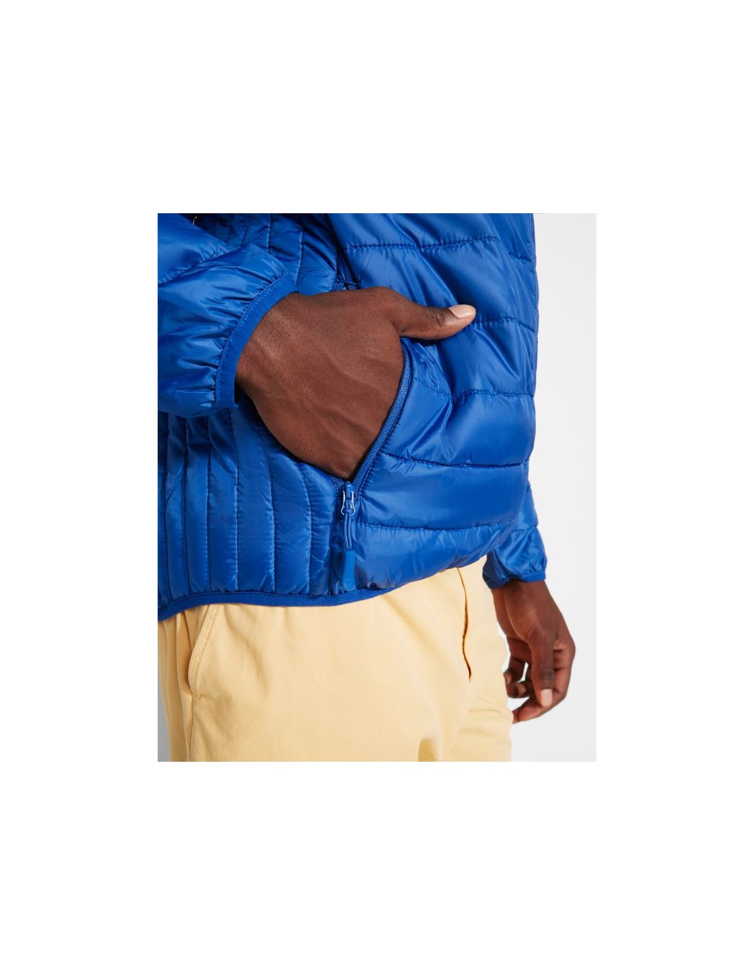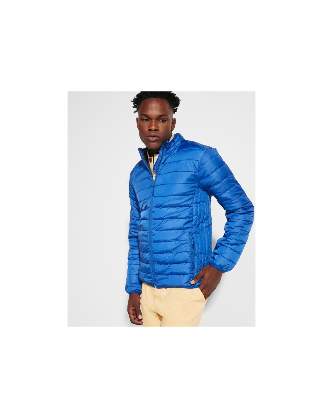 Giubbotto da uomo trapuntato con imbottitura tatto piuma, cerniere invertite in tinta con protettore per il mento e tiretto, due tasche frontali con cerniera, finiture elastiche in tinta su polsini e girovita, fodera interiore a contrasto, include custodia per il trasporto.
