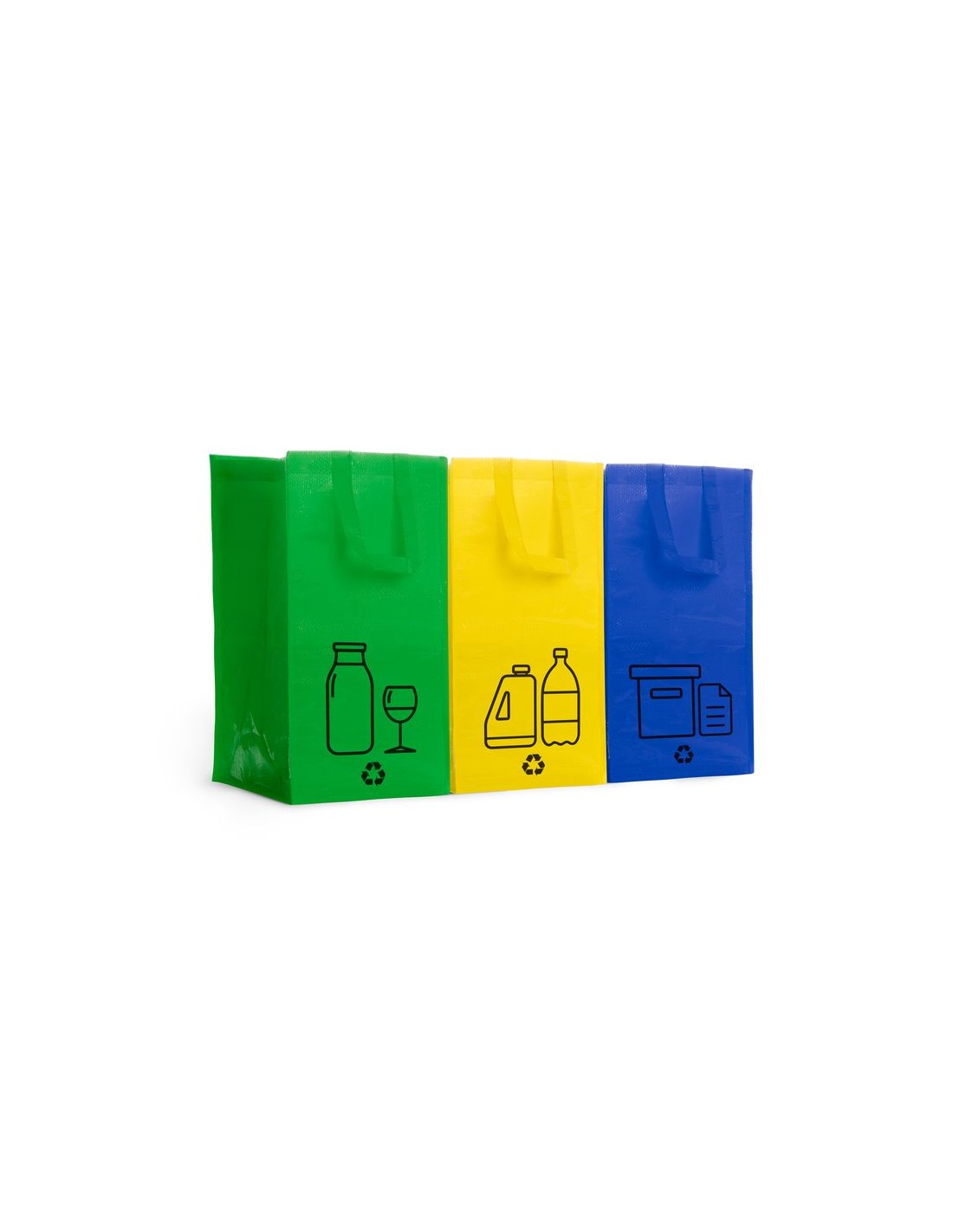 Set di 3 sacchetti per la raccolta differenziata realizzati in resistente tessuto pp laminato opaco con velcro laterale e manici rinforzati.