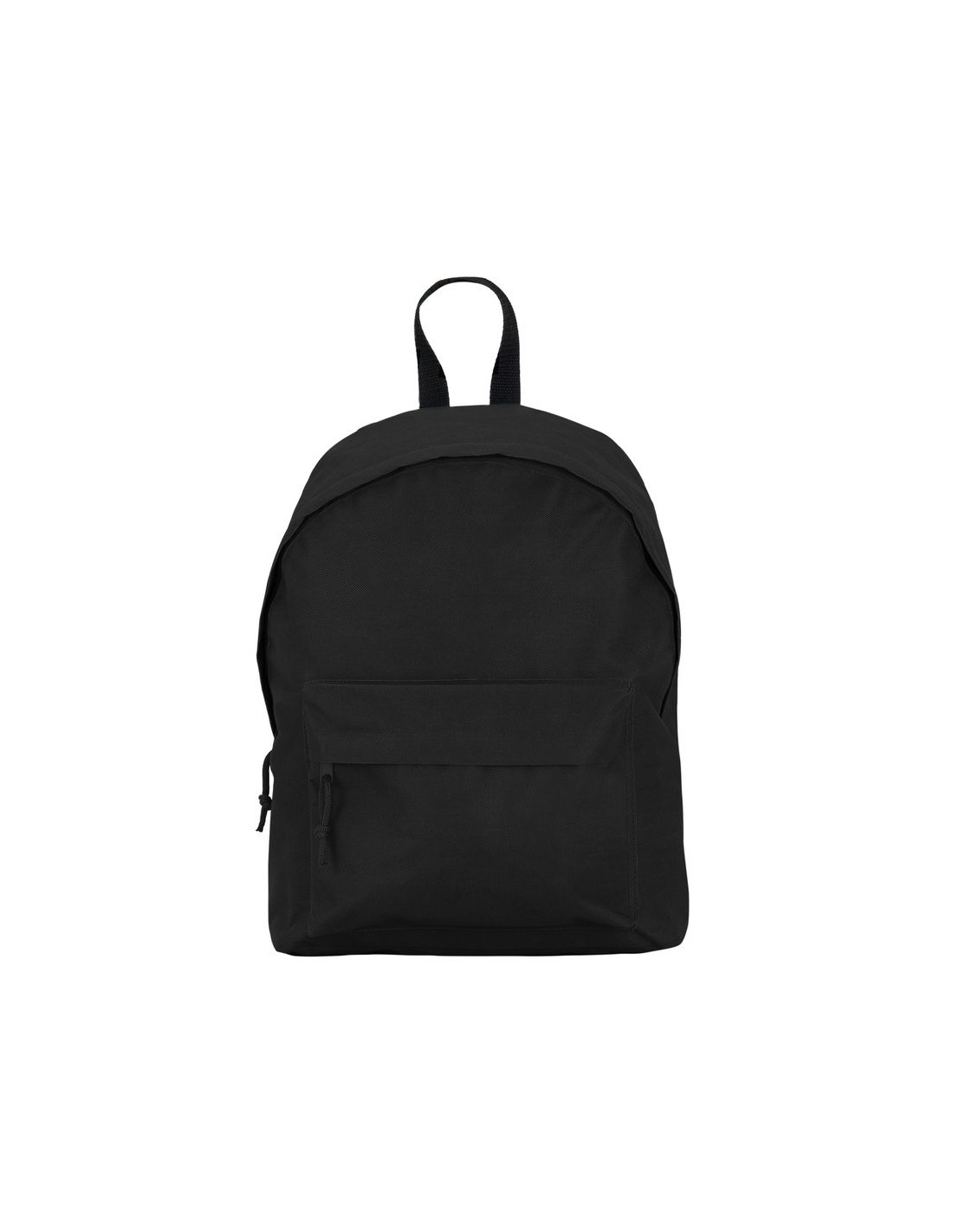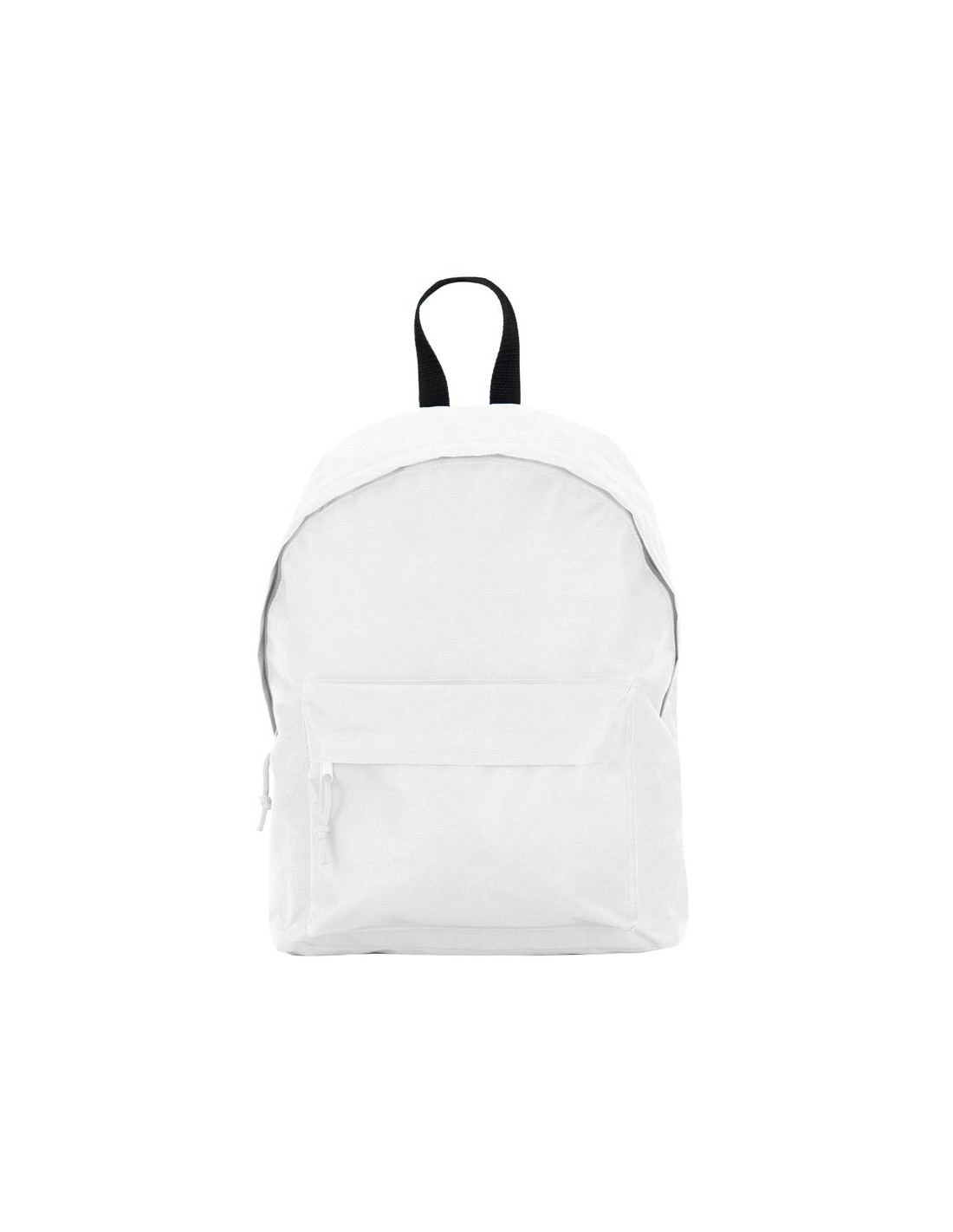 Zaino basico in tessuto resistente, doppia cinghia per le spalle e maniglia in contrasto, due tasche laterali, uno frontale, con cerniera e tiretto in tono.